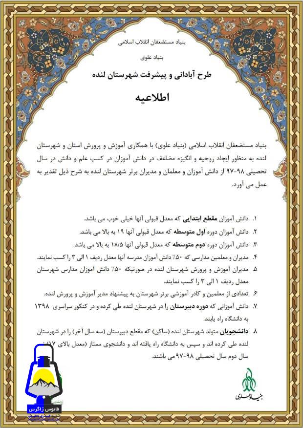 چرا وقتی بنیاد علوی می خواست ، برای اولین بار در سطح شهرستان لنده از دانشجویان معدل بالای ۱۷ ، نیمسال دوم سال تحصیلی ۹۸-۹۷ دربند ۸ اطلاعیه خود تجلیلی بعمل آورد ، شما هیچ لیستی ارائه ندادید ؟
