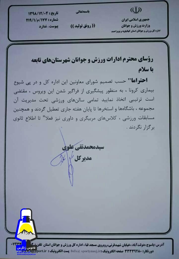 به گزارش پایگاه خبری تحلیلی فانوس زاگرس ، طی دستورالعملی از سوی مدیرکل ورزش و جوانان استان کهگیلویه و بویراحمد به رؤسای ادارات ورزش و جوانان شهرستانهای تابعه ،تمامی سالن های ورزشی ، باشگاهها و استخرهای کهگیلویه و بویراحمد تعطیل شدند و مسابقات ورزشی و کلاس های مربیگری و داوری تا اطلاع ثانوی برگزار نمیشوند.