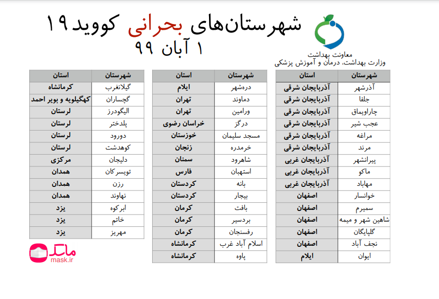 شهرستانهای دماوند و ورامین از استان تهران، درگز از استان خراسان رضوی، مسجد سلیمان از استان خوزستان، خرمدره از استان زنجان، شاهرود از استان سمنان، استهبان از استان فارس، بانه و بیجار از استان کردستان، بافت، بردسیر، رفسنجان از استان کرمان، اسلام آباد غرب، پاوه و گیلان غرب از استان کرمانشاه، گچساران از استان کهگیلویه و بویراحمد، الیگودرز، پلدختر، دورود و کوهدشت از استان لرستان، دلیجان از استان مرکزی، تویسرکان، رزن و نهاوند از استان همدان، ابرکوه، خاتم و مهریز از استان یزد نیز در فهرست شهرستانهای بحرانی کووید ۱۹ قرار دارند.