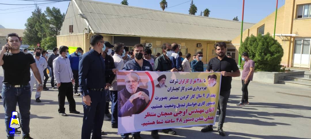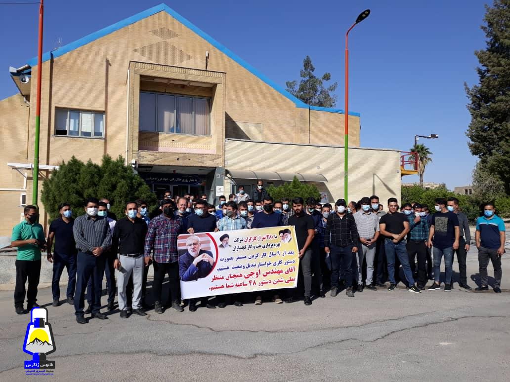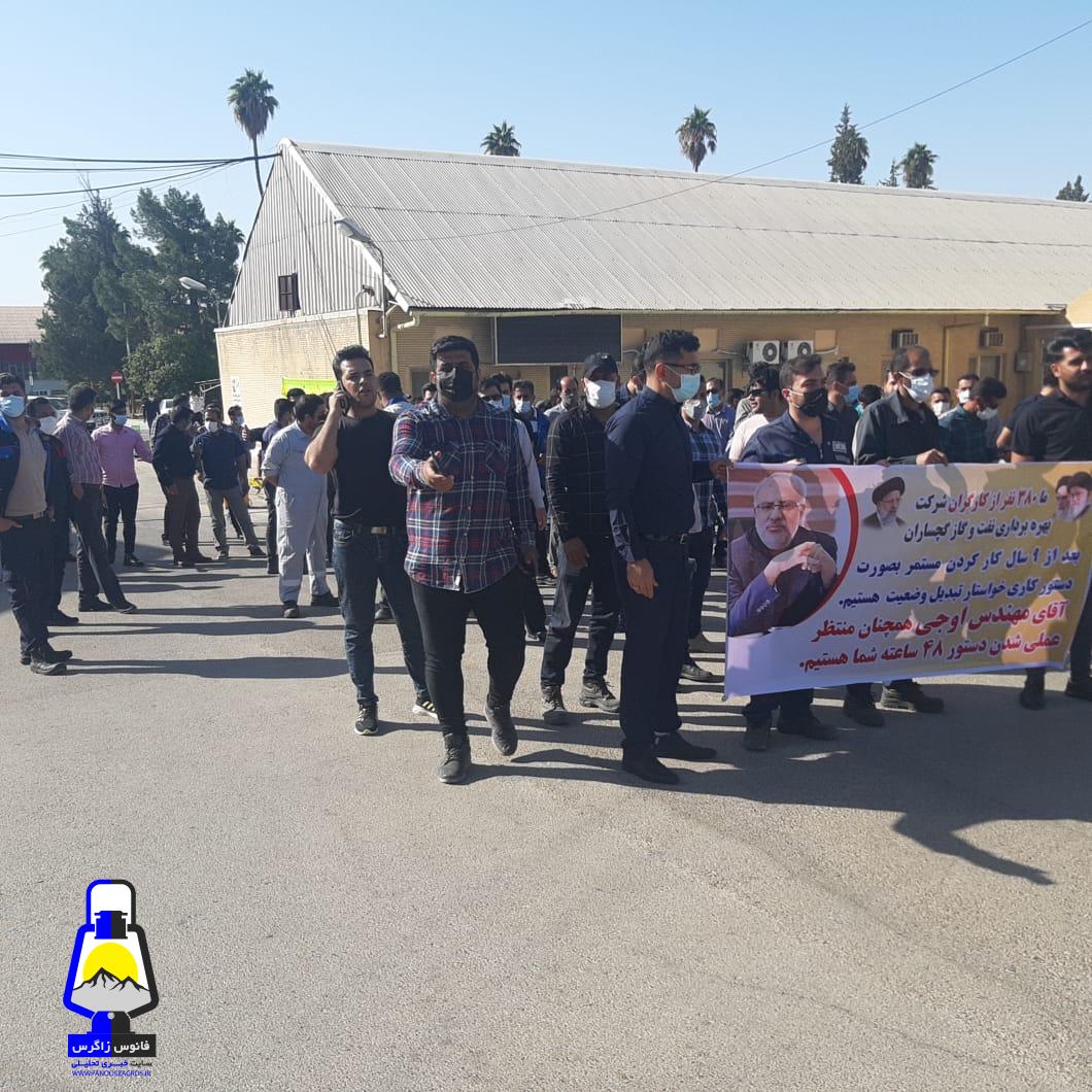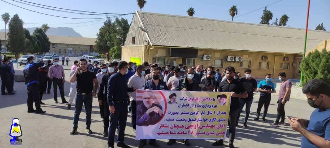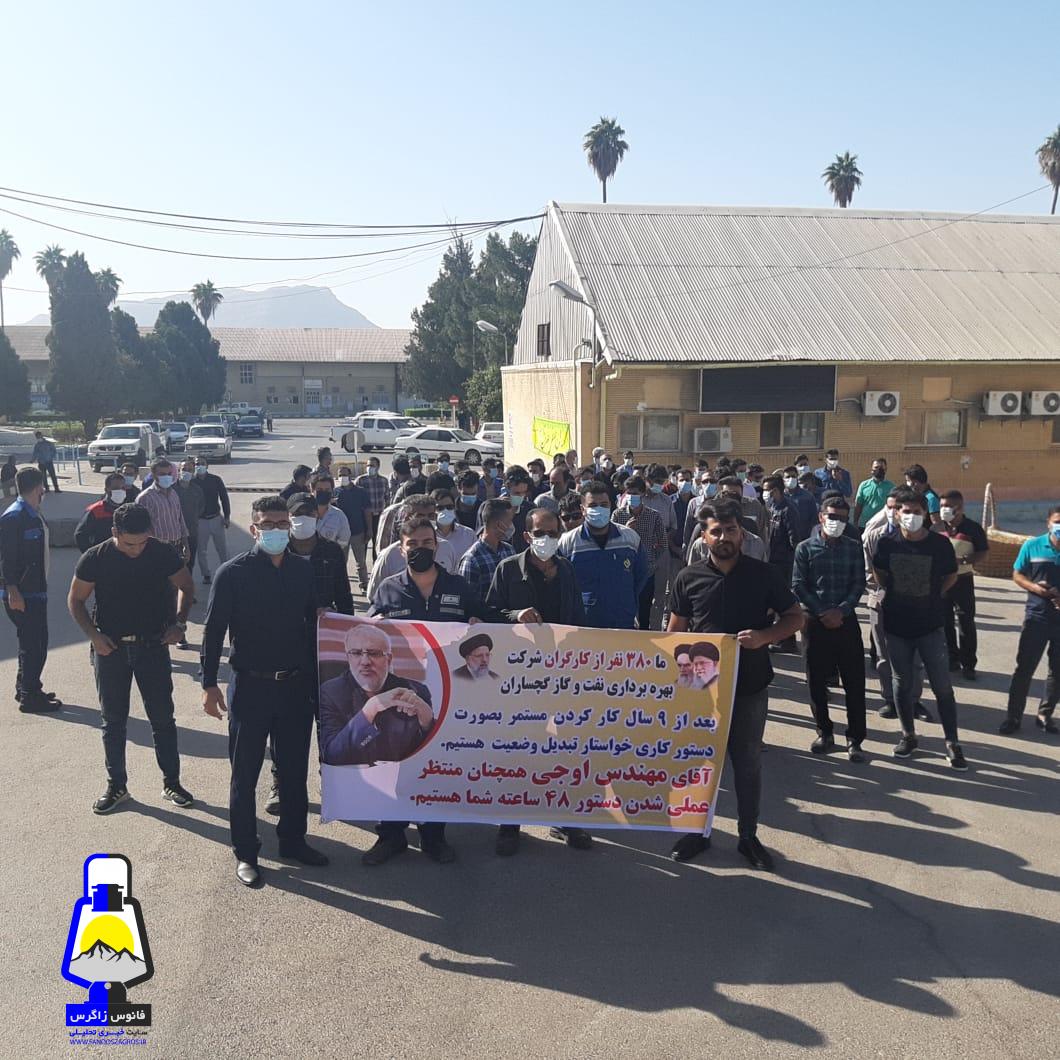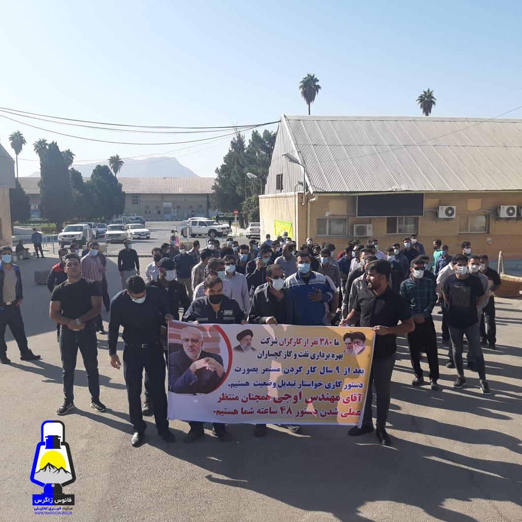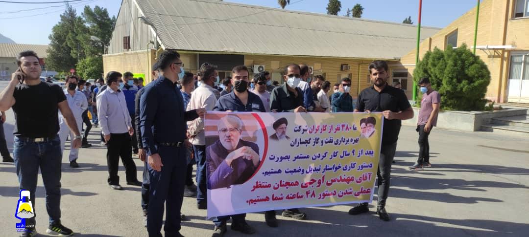 نیروهای حجمی شرکت بهره برداری نفت و گاز گچساران در اعتراض و وضعیت مبهم کاری و شغلی خود جلوی ساختمان اداره مرکزی شرکت بهره برداری نفت و گاز گچساران تجمع کردند.