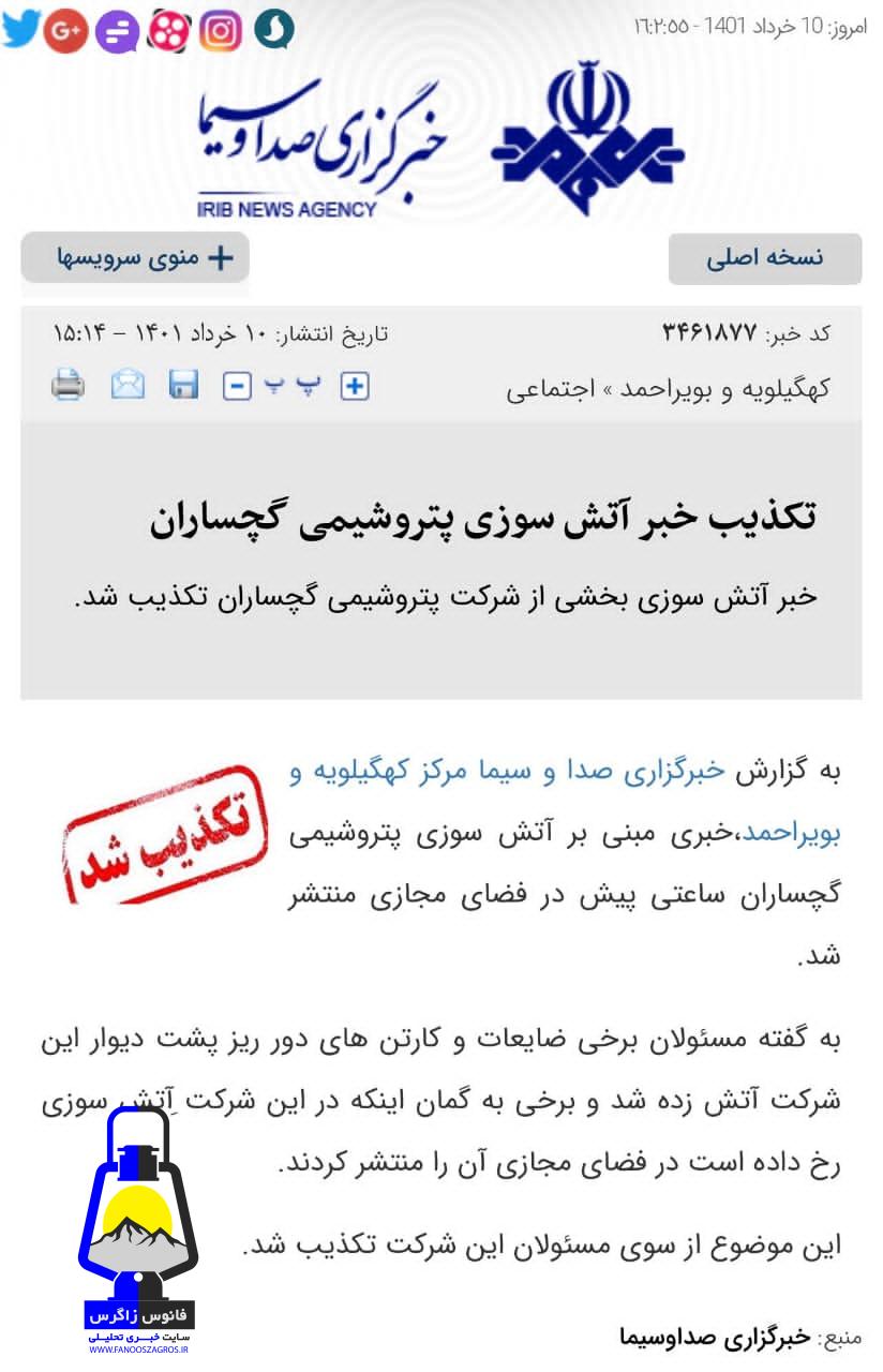نکته قابل تامل اینجاست که در سایت و پایگاه خبری خبرگزاری صدا و سیمای استان کهگیلویه و بویراحمد خلاف واقعیت رخ داده خبر آتش سوزی پتروشیمی گچساران به نقل از مسولین این شرکت تکذیب شده است.