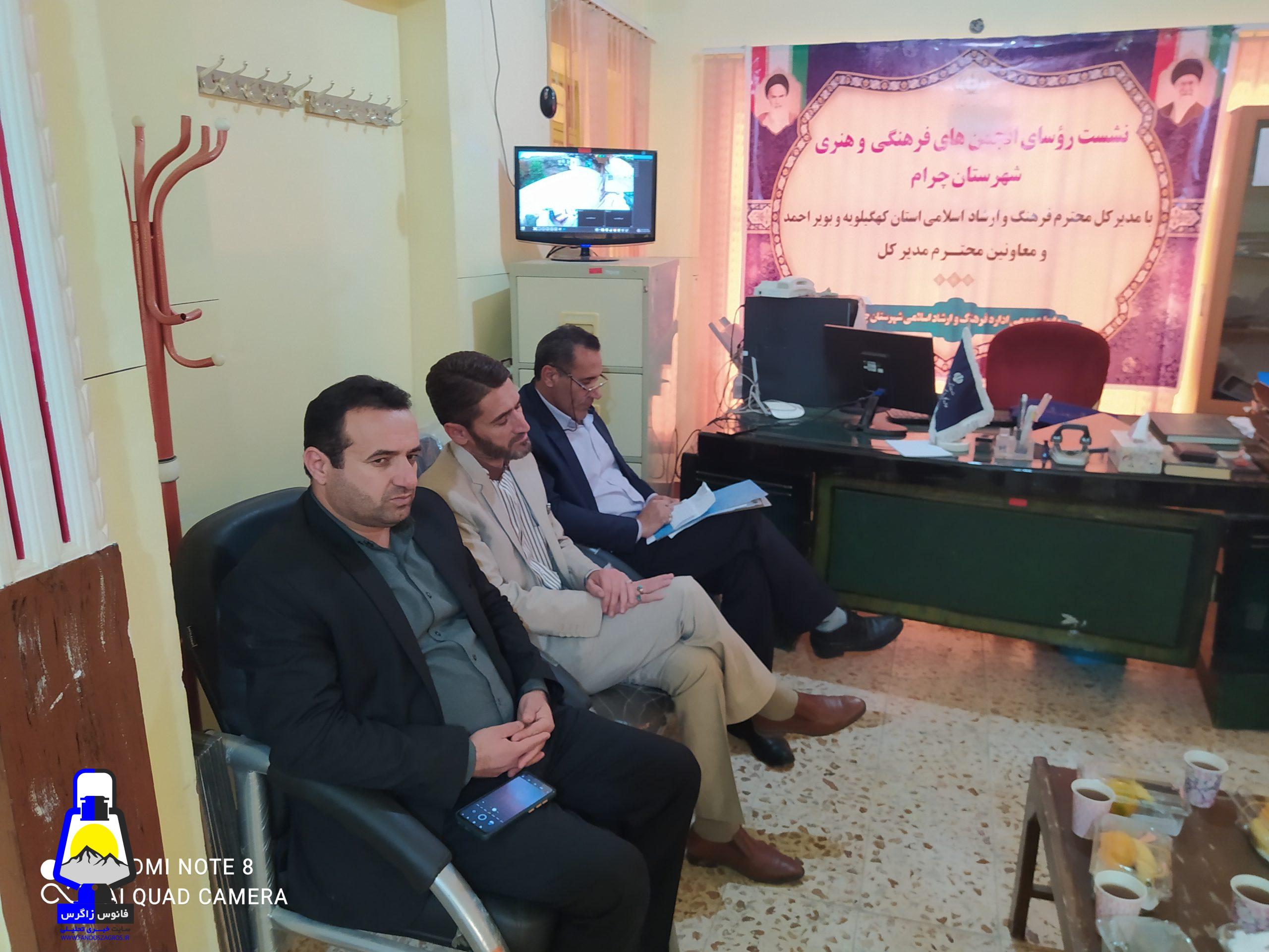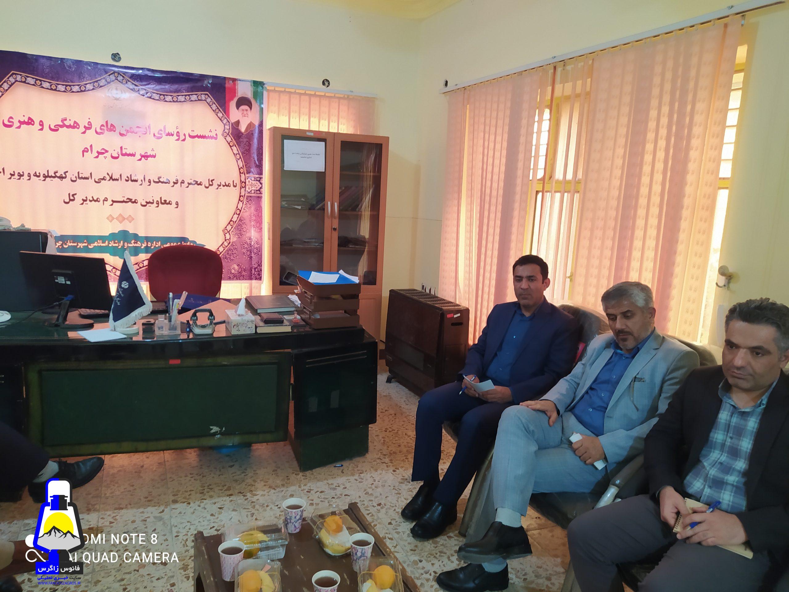 دکتر درخشان مدیر کل فرهنگ و ارشاد اسلامی روز پنجشنبه ساعت دو در جمع هنرمندان شهرستان چرام حاضر و به دغدغه های مطرح شده گوش سپردند.