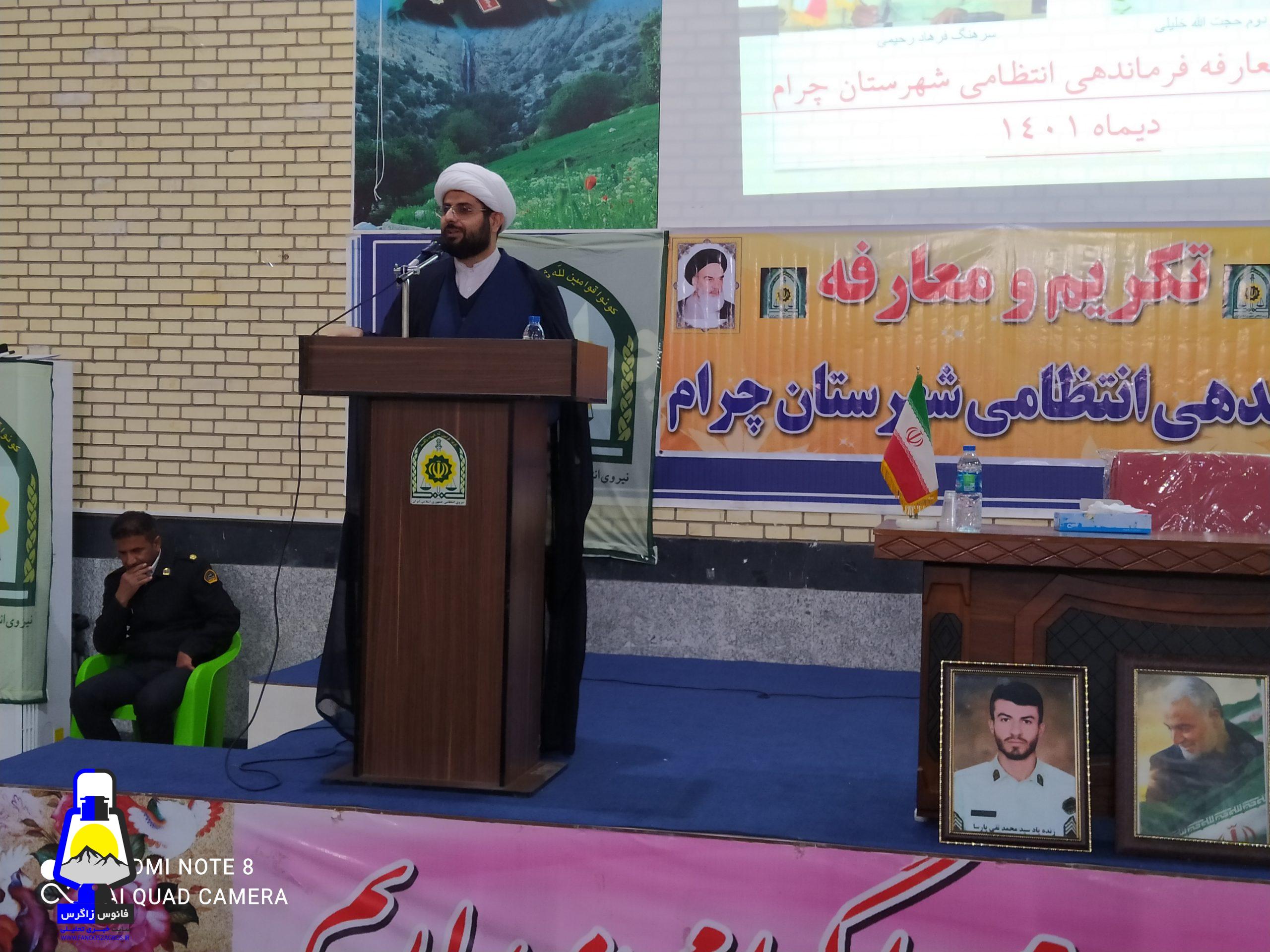 امام جمعه چرام دکتر افشار سخنران دیگر مراسم بود و از تلاش های بی وقفه نیروی انتظامی در سطح شهرستان قدردانی نمود و انتصاب سرهنگ خلیلی را تبریک گفت و از زحمات سرهنگ رحیمی تشکر کرد.