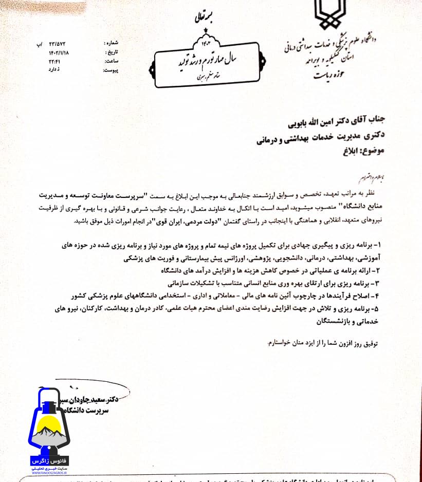 طی حکمی از طرف سرپرست دانشگاه علوم پزشکی وخدمات بهداشتی درمانی کهگیلویه وبویراحمد”سرپرست معاونت توسعه،مدیریت و منابع دانشگاه” منصوب شد.