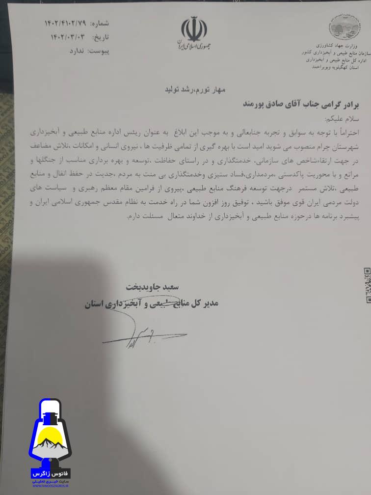 به گزارش فانوس زاگرس از چرام ، در این حکم صادق پورمند بعنوان رئیس اداره منابع طبیعی و آبخیزداری شهرستان چرام منصوب شد.
