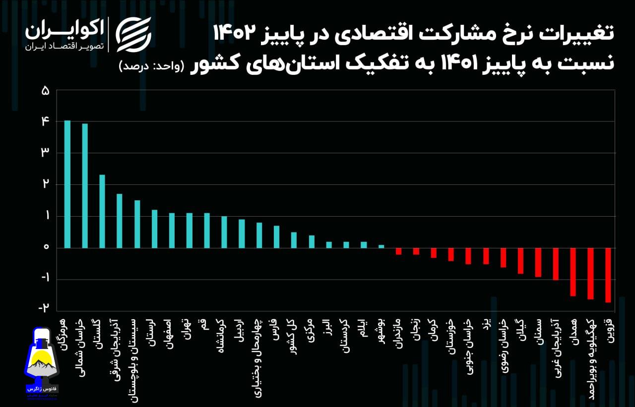 در این میان وضعیت تغییر نرخ مشارکت اقتصادی در یک سال خیر حاکی از این است که بیشترین رشد این نرخ مربوط به استان هرمزگان بوده است. با این حال میزان مشارکت اقتصادی در ۱۳ استان بدتر شده است.