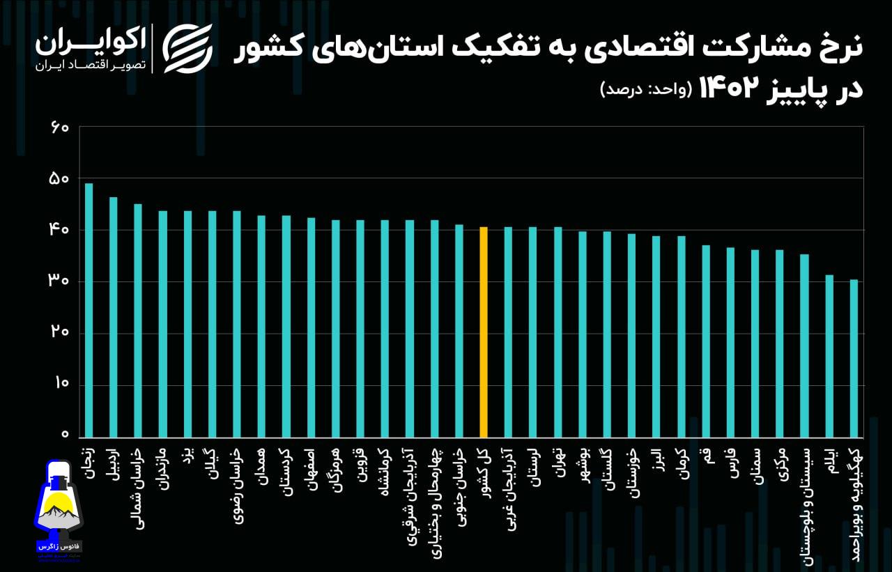 بیشترین نرخ مشارکت اقتصادی در کشور در پاییز ۱۴۰۲ مربوط به استان زنجان بوده است. ۴۹٫۸ درصد از جمعیت در سن کار این استان در بازار کار فعال بودهاند. اردبیل، خراسان شمالی و مازندران نیز نرخ مشارکت بالایی در اقتصاد داشتهاند.