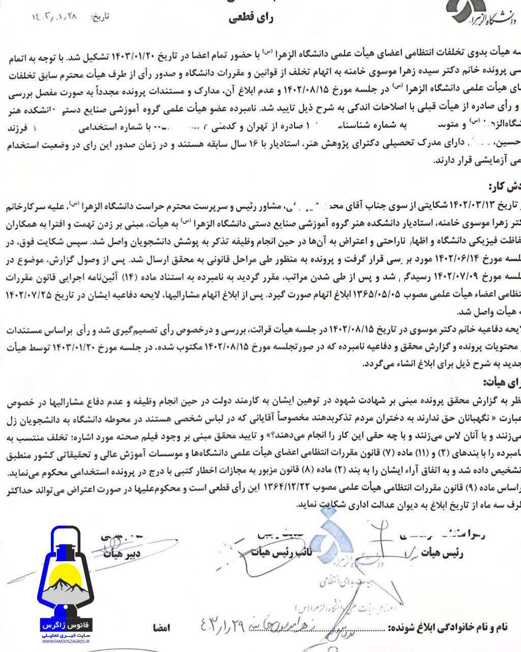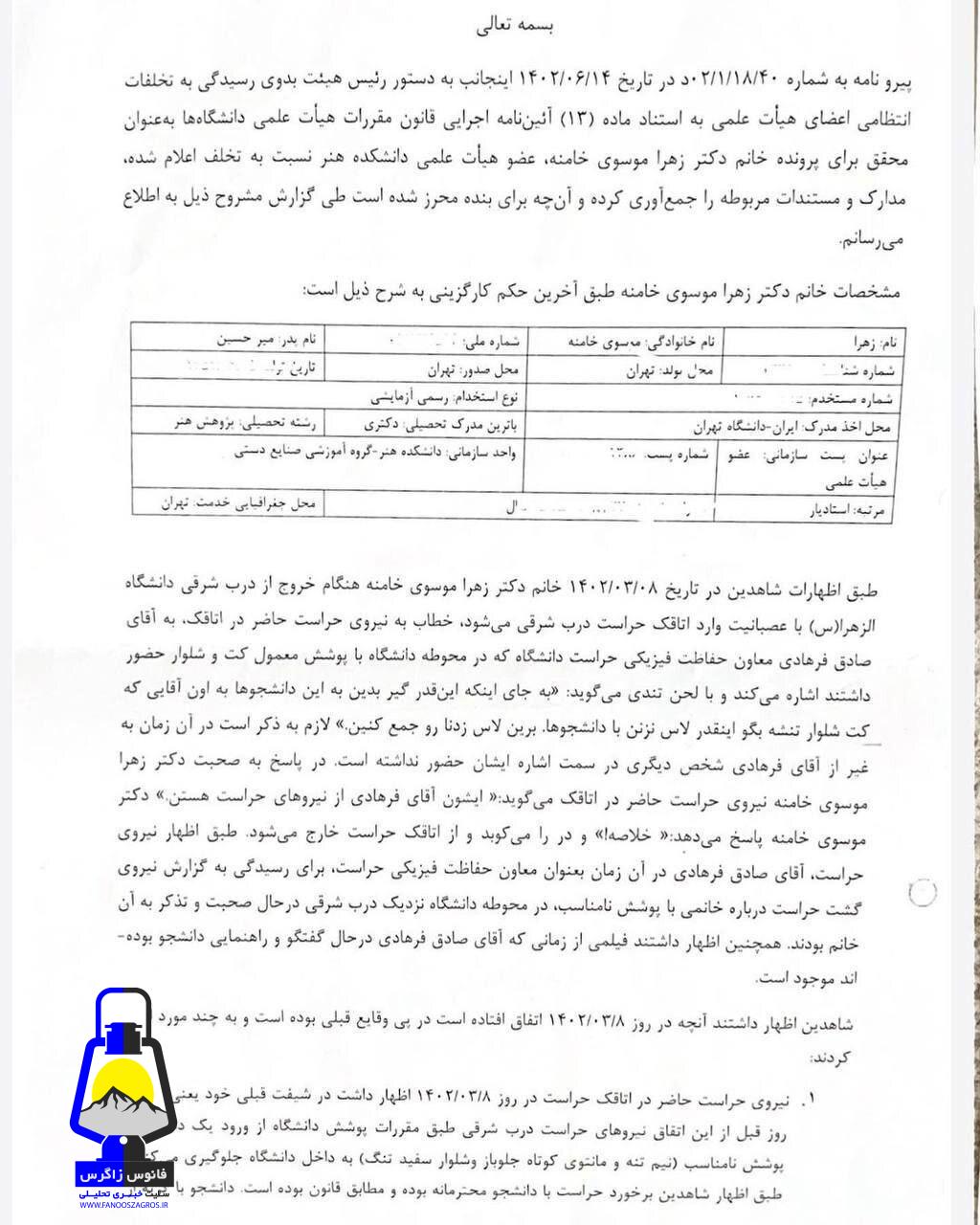 به گزارش فانوس زاگرس به نقل از فرارو؛ سند بررسی هیات بدوی تخلفات و اخراج زهرا موسوی دختر میرحسین موسوی و زهرا رهنورد از دانشگاه الزهرا منتشر شد.