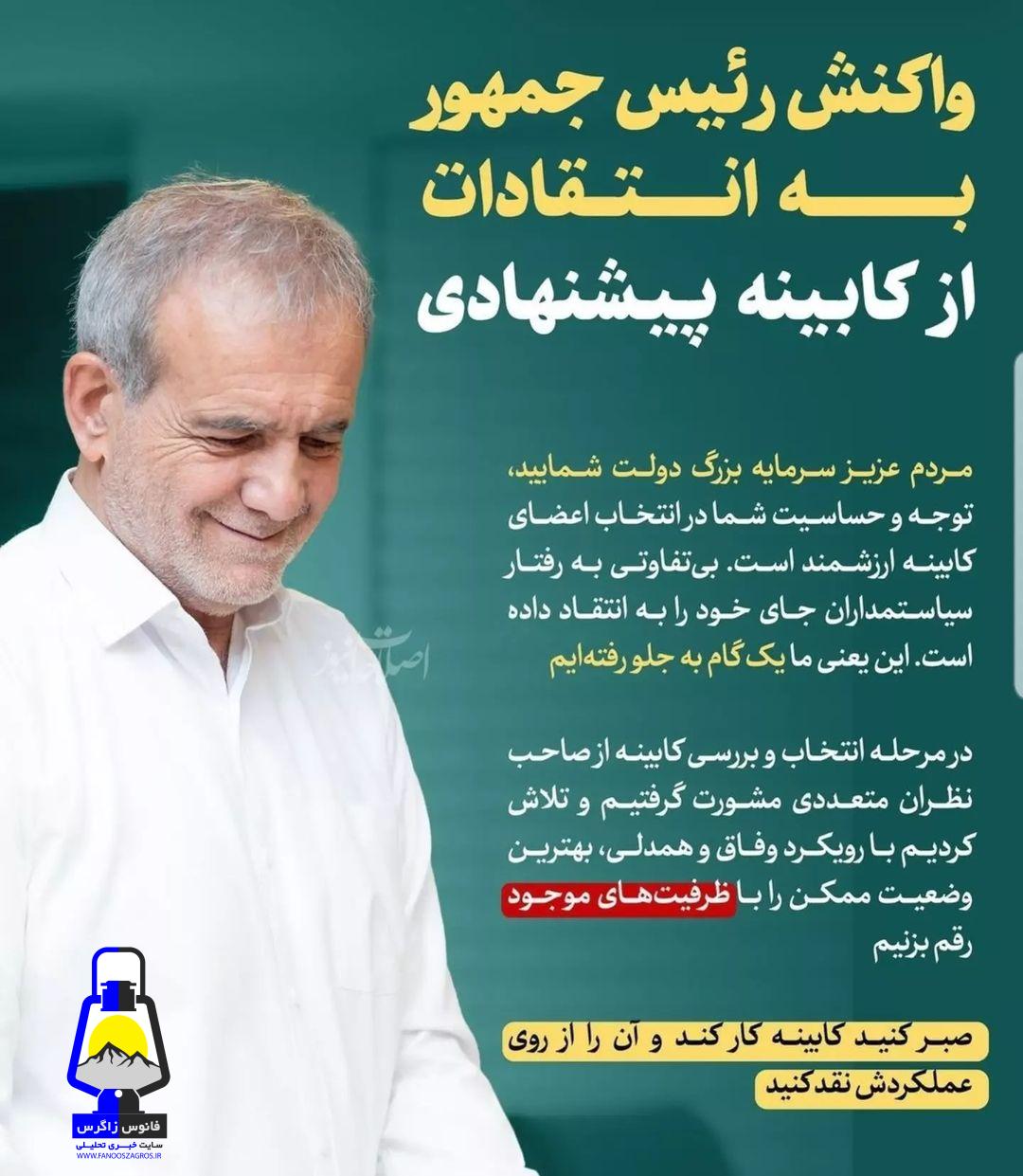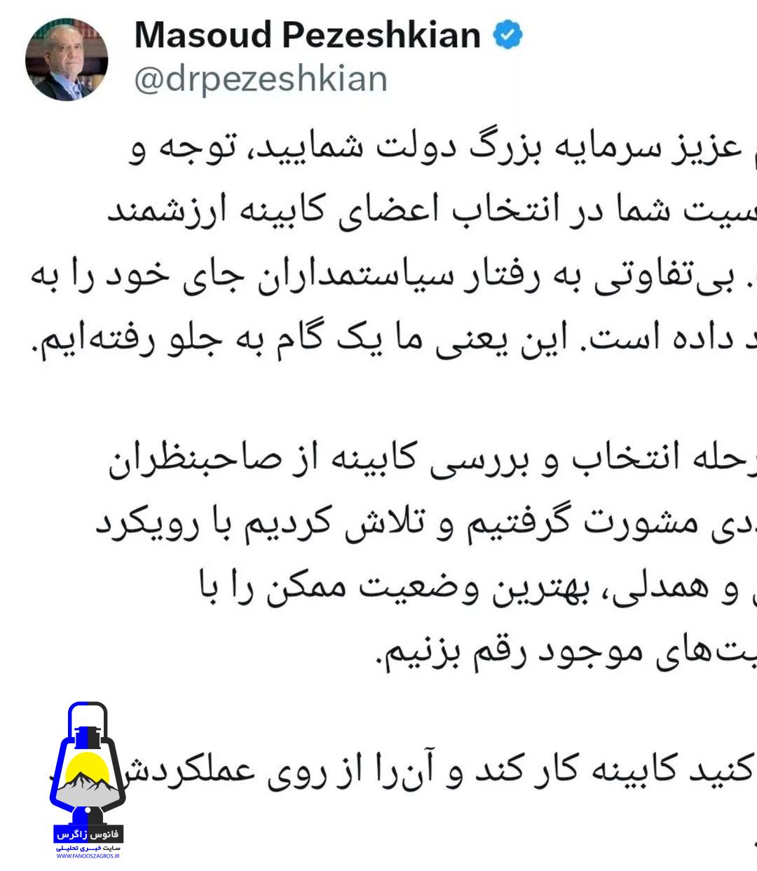 به گزارش فانوس زاگرس ، مسعود پزشکیان در اولین واکنش خود پس از معرفی اعضای کابینه دولت چهاردهم نوشت:
