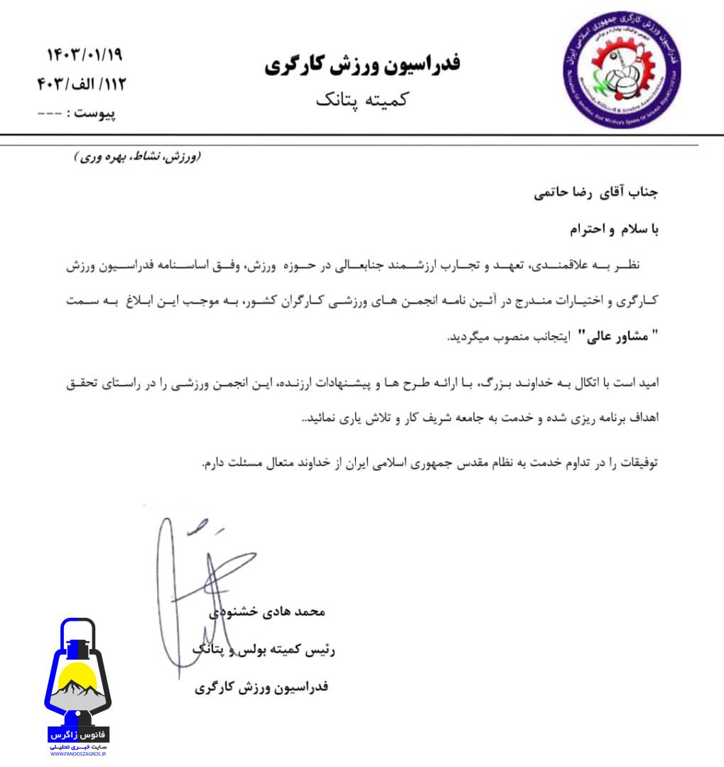 به گزارش فانوس زاگرس ، طی حکمی از سوی محمدهادی خشنودی ، رئیس کمیته بولس و پتانک فدراسیون ورزش کارگری ، رضا حاتمی بعنوان مشاور عالی این فدراسیون منصوب شد.