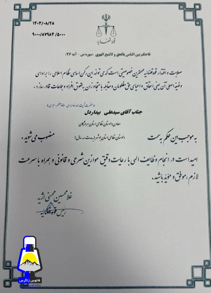 به گزارش فانوس زاگرس ،طی حکمی از سوی حجت الاسلام غلامحسین محسنی اژه ای رئیس قوه قضائیه ،سید علی بیدار دل بعنوان دادستان نظامی استان بوشهر بمدت سه سال منصوب شد.