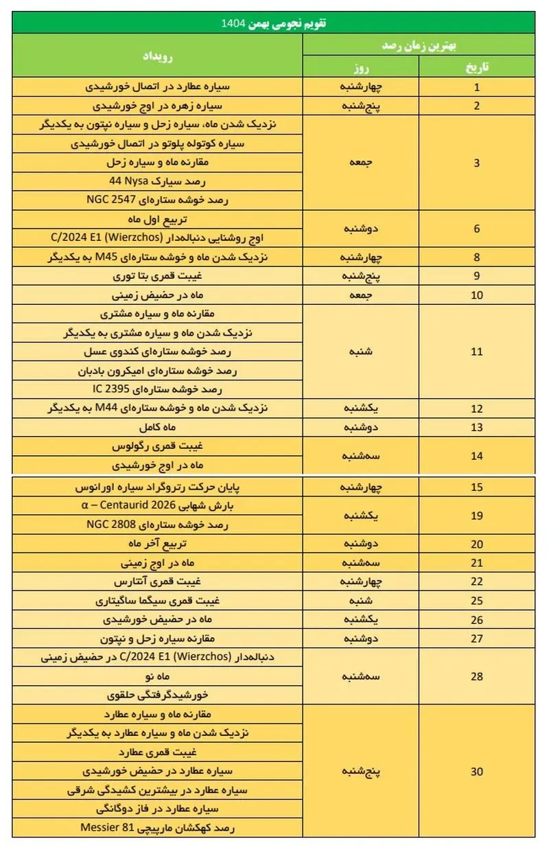 گروه علمی:در ماه جاری کیهان شاهد سیاره عطارد در اتصال خورشیدی، سیاره زهره در اوج خورشیدی، نزدیک شدن ماه، سیاره زحل و سیاره نپتون به یکدیگر، سیاره کوتوله پلوتو در اتصال خورشیدی، مقارنه ماه و سیاره زحل، سیارک ۴۴ Nysa، خوشه ستارهای NGC 2547، تربیع اول ماه، دنبالهدار C/2024 E1 (Wierzchos) در اوج روشنایی، نزدیک شدن ماه و خوشه ستارهای M45 به یکدیگر، غیبت قمری بتا توری، ماه در حضیض زمینی، مقارنه ماه و سیاره مشتری، نزدیک شدن ماه و سیاره مشتری به یکدیگر، خوشه ستارهای کندوی عسل، خوشه ستارهای امیکرون بادبان، خوشه ستارهای IC 2395، نزدیک شدن ماه و خوشه ستارهای M44 به یکدیگر، ماه کامل، غیبت قمری رگولوس، ماه در اوج خورشیدی، پایان حرکت رتروگراد سیاره اورانوس، بارش شهابی α- Centaurid 2026، خوشه ستارهای NGC 2808، تربیع آخر ماه، ماه در اوج زمینی، غیبت قمری آنتارس، غیبت قمری سیگما ساگیتاری، ماه در حضیض خورشیدی، مقارنه سیاره زحل و نپتون، دنبالهدار C/2024 E1 (Wierzchos) در حضیض زمینی، ماه نو، خورشیدگرفتگی حلقوی، مقارنه ماه و سیاره عطارد، نزدیک شدن ماه و سیاره عطارد به یکدیگر، غیبت قمری عطارد، سیاره عطارد در حضیض خورشیدی، سیاره عطارد در بیشترین کشیدگی شرقی، سیاره عطارد در فاز دوگانگی و کهکشان مارپیچی Messier 81 خواهد بود.جزئیات تمام رویدادهای نجوم ماه جاری را میتوانید در جدول زیر مشاهده کنید:
